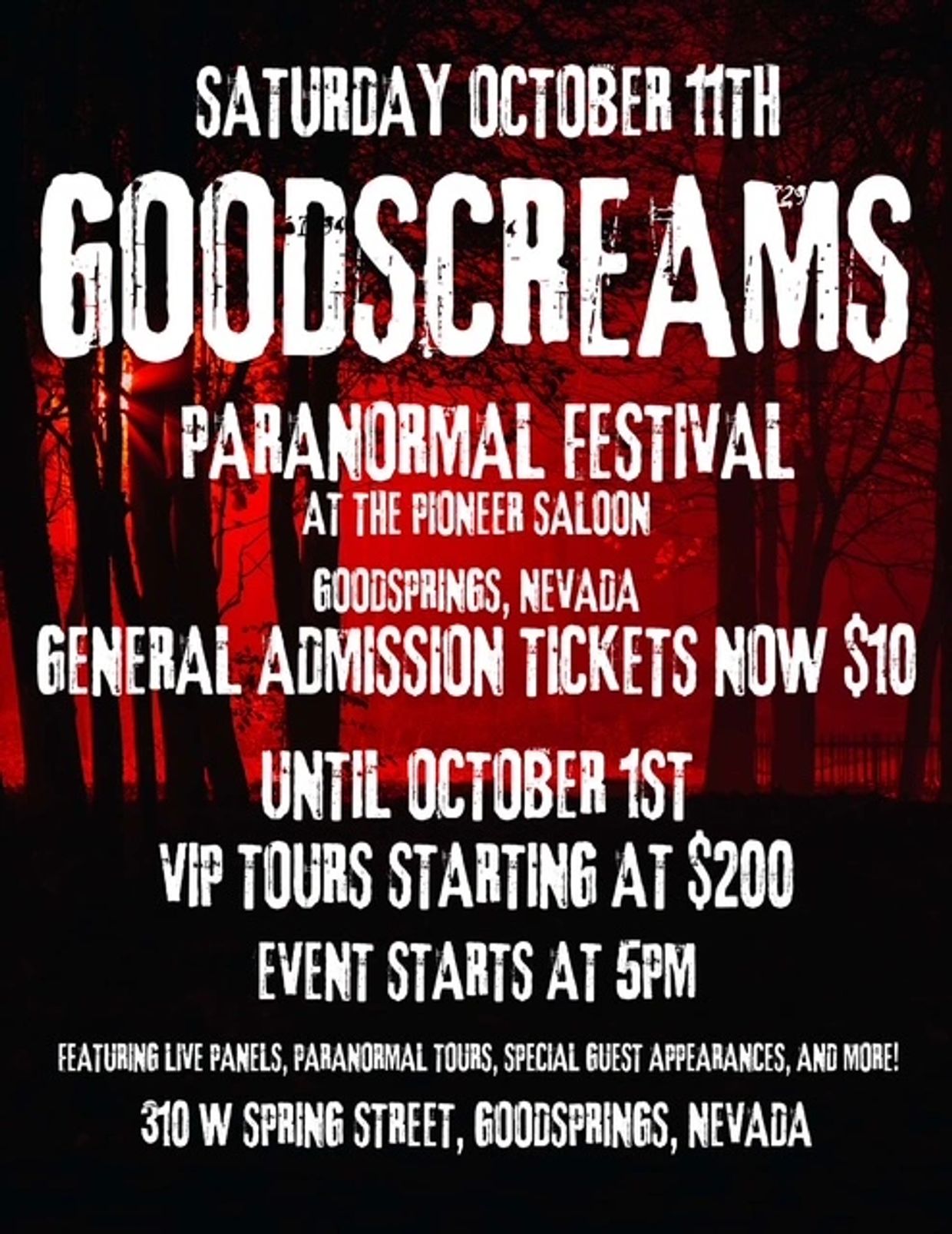 RIGHT NOW - until October 1st - all General Admission tickets are $10 for our first-ever "Goodscreams" Paranormal Festival! Come enjoy live panels, vendors, special guests like Jay Wasley of Ghost Adventures and more! There is also an exclusive option where you can do a paranormal investigation with Jay after the Saloon closes.